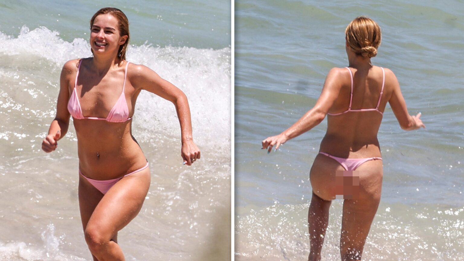 The 25-year-old wore a teeny tiny pink bikini over her toned figure, which she showed off playfully by bending over — forwards and backwards — in full view of cameras.
