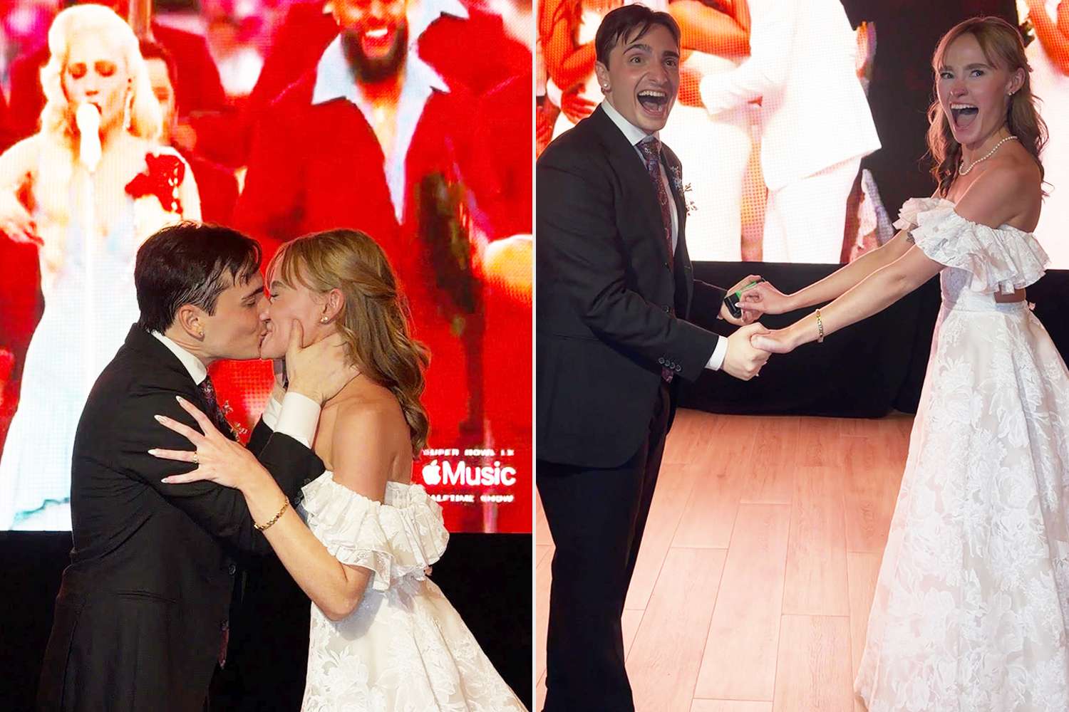 "There was no way we could’ve ever predicted that, and our faces show it," she says. "Our guests also went insane when they realized what was happening onscreen. After so much back-and-forth on whether our wedding date and halftime show streaming was the right choice, it felt like divine timing. It’s only been made better by knowing that the marriage onscreen was real — congratulations to the happy couple!”