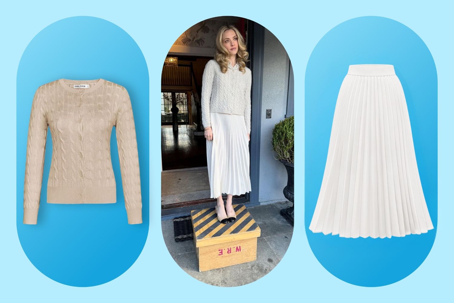 Her outfit was timeless and rich-looking in the best way: a soft cable-knit cardigan worn buttoned up, a crisp white pleated midi skirt, and sophisticated cap-toe heels. She finished the look with a strand of pearls and subtle gold jewelry. It’s an outfit that works just as well for the office as it does for dinner, with easy styling swaps like wearing the cardigan open over a camisole in warmer weather or layering it under a wool coat in winter.