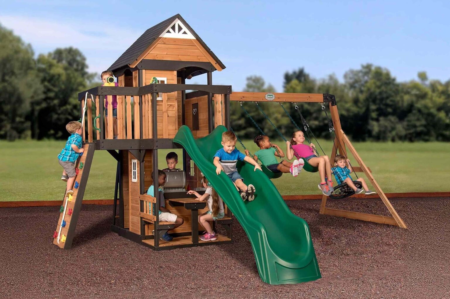 The Backyard Discovery Canyon Creek Swing Set isn’t your average backyard playset. Its elevated clubhouse and built-in climbing features give it a more substantial feel, while the cedar construction is designed to last through multiple seasons of outdoor play.