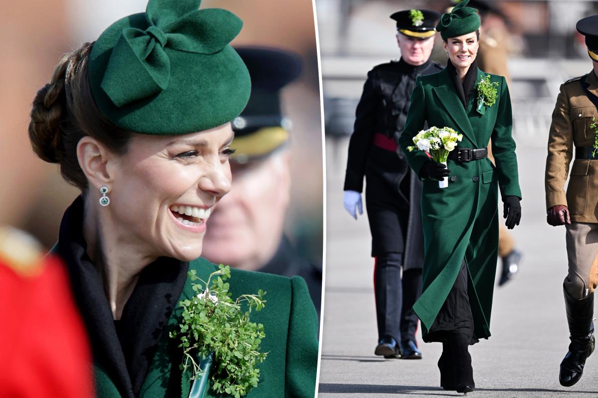 The Princess of Wales, 44, stepped out at Mons Barracks in Aldershot, England, on Tuesday for the Irish Guards’ St. Patrick’s Day Parade, where she presented traditional sprigs of shamrock to soldiers — and the regiment’s Irish Wolfhound mascot, Seamus — in an outfit worthy of the emerald isle.
