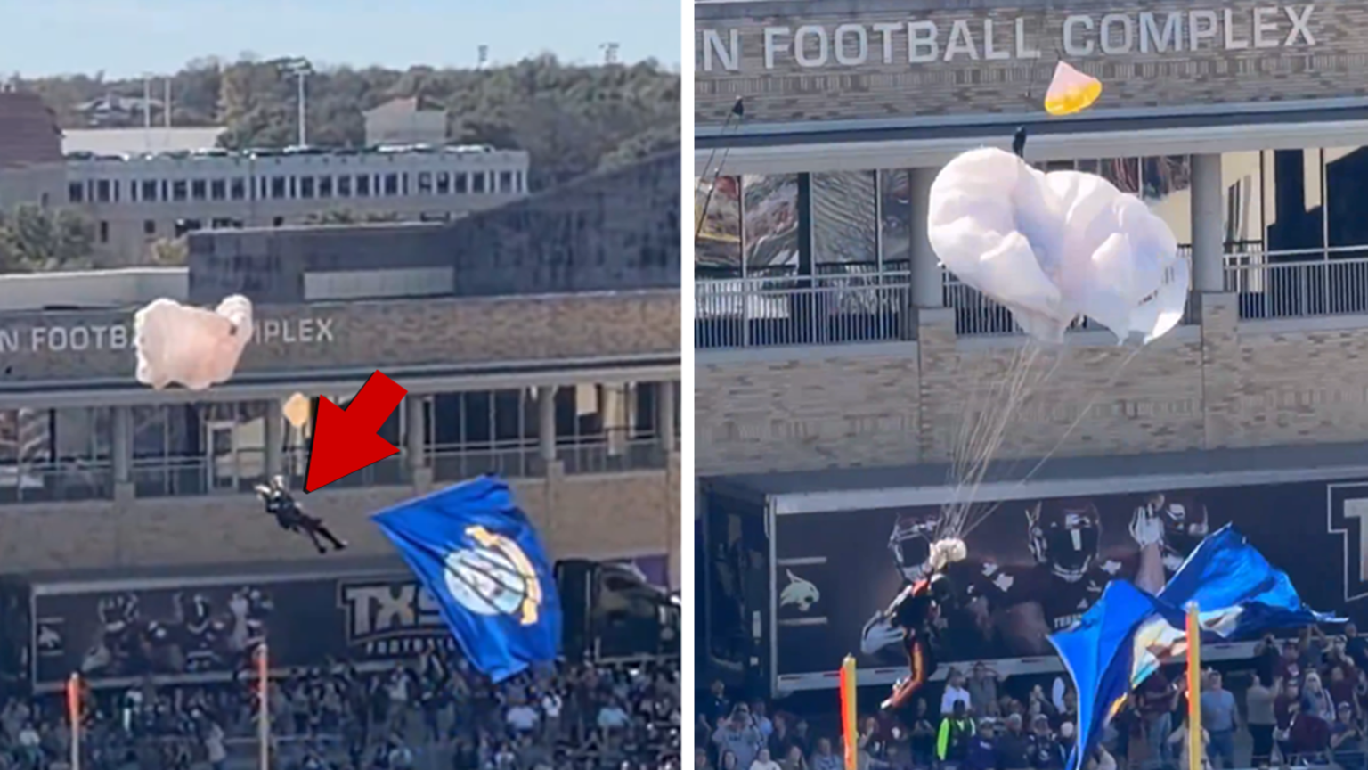 According to WFAA, a local Dallas outlet, the parachutist was able to walk off the field under his own power … though we’re sure he’ll be a little sore in the morning.