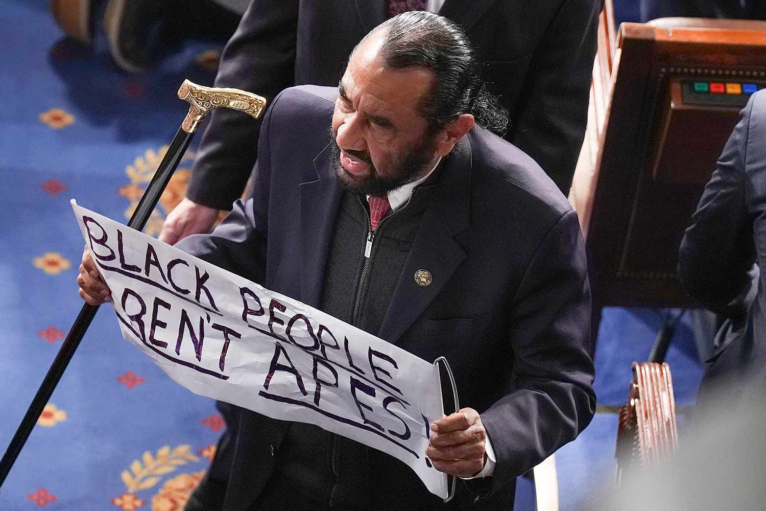 Texas Rep. Al Green disrupted President Donald Trump's State of the Union address on Tuesday, Feb. 24, with a sign that read "Black People Aren't Apes" in reference to a racist video depicting former President Barack Obama and Michelle Obama as apes previously shared on Trump's Truth Social account.