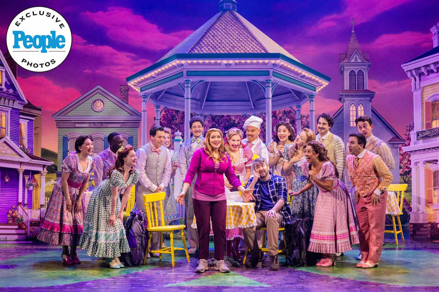 The images, snapped by Matthew Murphy and Evan Zimmerman, capture the full company in a technicolor dreamscape: a storybook village framed by lush greenery and cascading wisteria, with pastel houses, a gazebo centerpiece and a bright blue sky backdrop that feels pulled straight from a Golden Age musical.