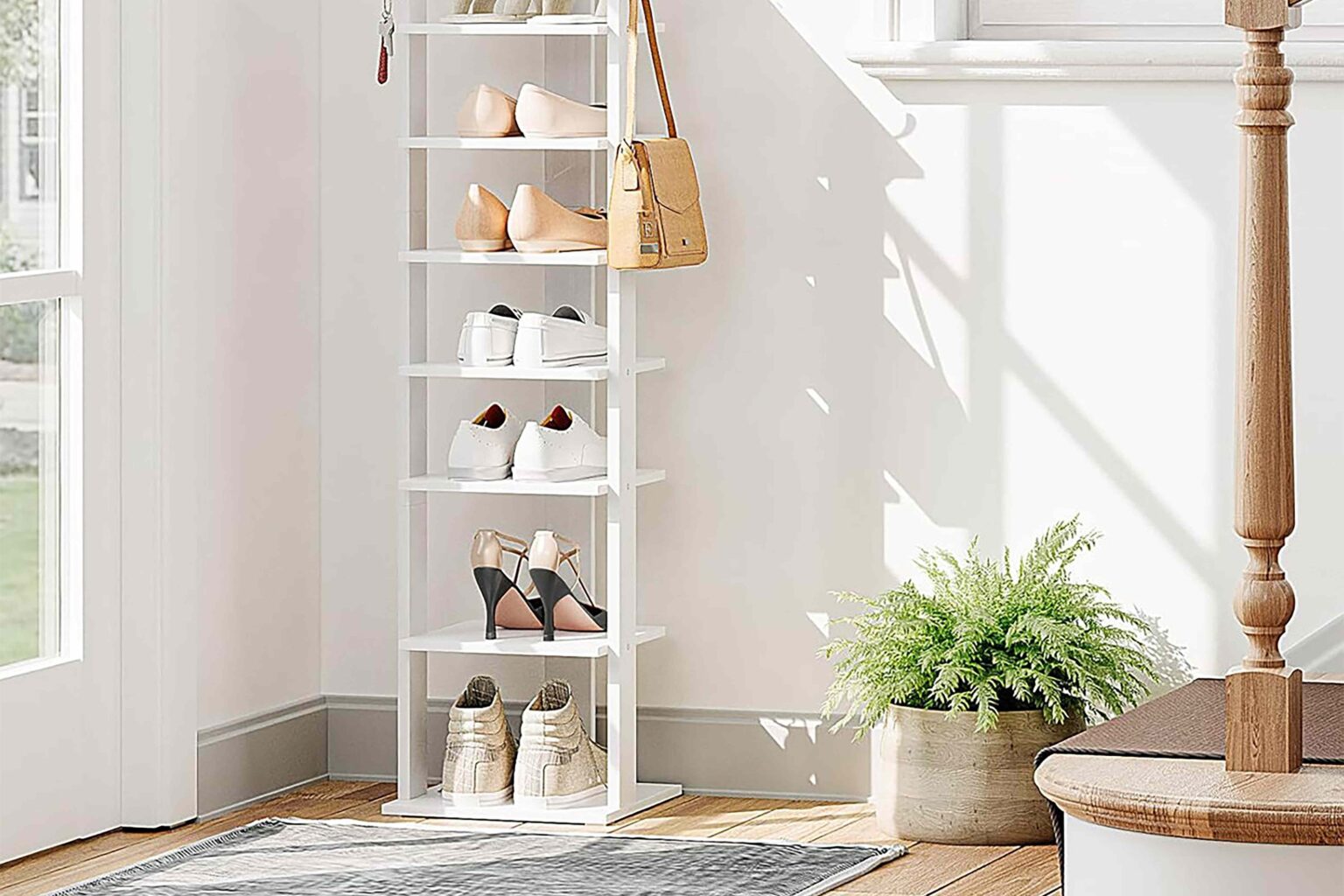 This tall and slender rack accommodates entryway corners and narrow closets, and the eight tiers can hold multiple pairs of shoes without taking up too much floor space. It’s made from durable wood and includes a wall anchor, which makes it a sturdy solution that won’t wobble or shake every time you remove or add a pair.