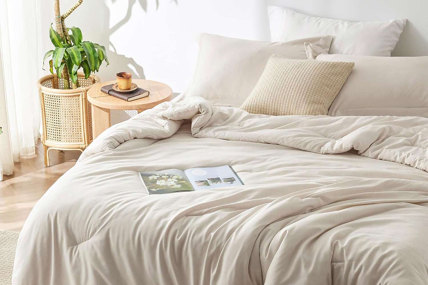 If a full bedding refresh is in order, this set — complete with sheets, a comforter, and pillow shams — has everything you need. The sheets are crisp white with a deep pocket that accommodates mattresses up to 14 inches thick and a 360-degree elastic band to keep the sheet secure.