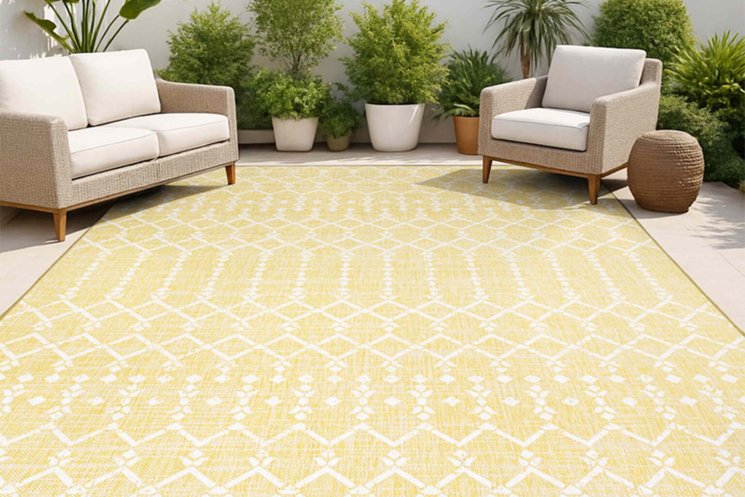 - High Foot Traffic: Dakota Fields Krystina Moroccan Geometric Textured Weave Yellow/Cream Indoor/Outdoor Rug, $45 (orig. $93)